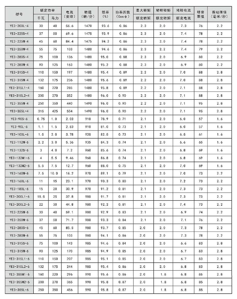 YE3系列超高效率三相異步電動機是國家推廣使用的超寄效節(jié)能產(chǎn)品。 我公司生產(chǎn)的YE3系列(IP55)高效率三相異步電動機(機座號80 ~ 355)是達到能效限定值的低壓全封閉自扇冷式超高效率訊籠三相異步電動機,其效率值完全達到GB18613-2020 《電動機能效限定值及能效等級》中的能效3級要求, 與國際標準 IEC60034-30中IE3保持 一 致。 該系列產(chǎn)品整機結(jié)構(gòu)緊湊, 外形美觀大方, 具有高效、 節(jié)能、 性能好、 振動小、 噪聲低、 壽命長 、 可靠性高、 起動轉(zhuǎn)矩大 、 使用維護方便等特點。廣泛應(yīng)用干一般無特殊要求的機械設(shè)備, 如農(nóng)業(yè)機械、 食品機械、 風(fēng)機、 水泵、 機床、 攪拌機、 空氣壓縮機等。