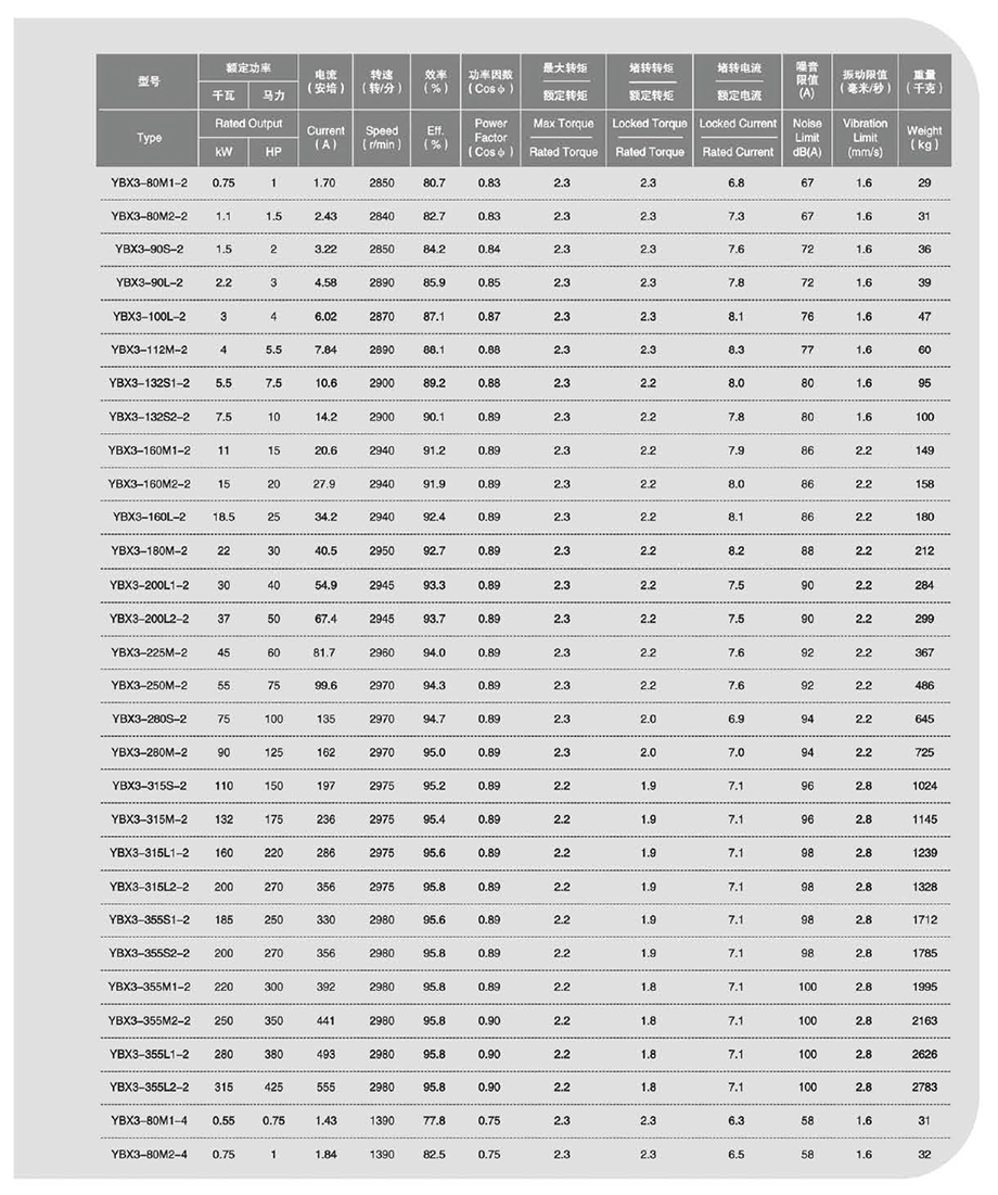 YBX3系列高效率隔爆型三相異步電動(dòng)機(jī)額定電壓380V、660V、380/660V,額定頻率50HZ,防護(hù)等級IP55,冷卻方法IC411,采取F級絕緣,滿載溫升按B級考核,適用于煤礦井下(非采掘工作面)及