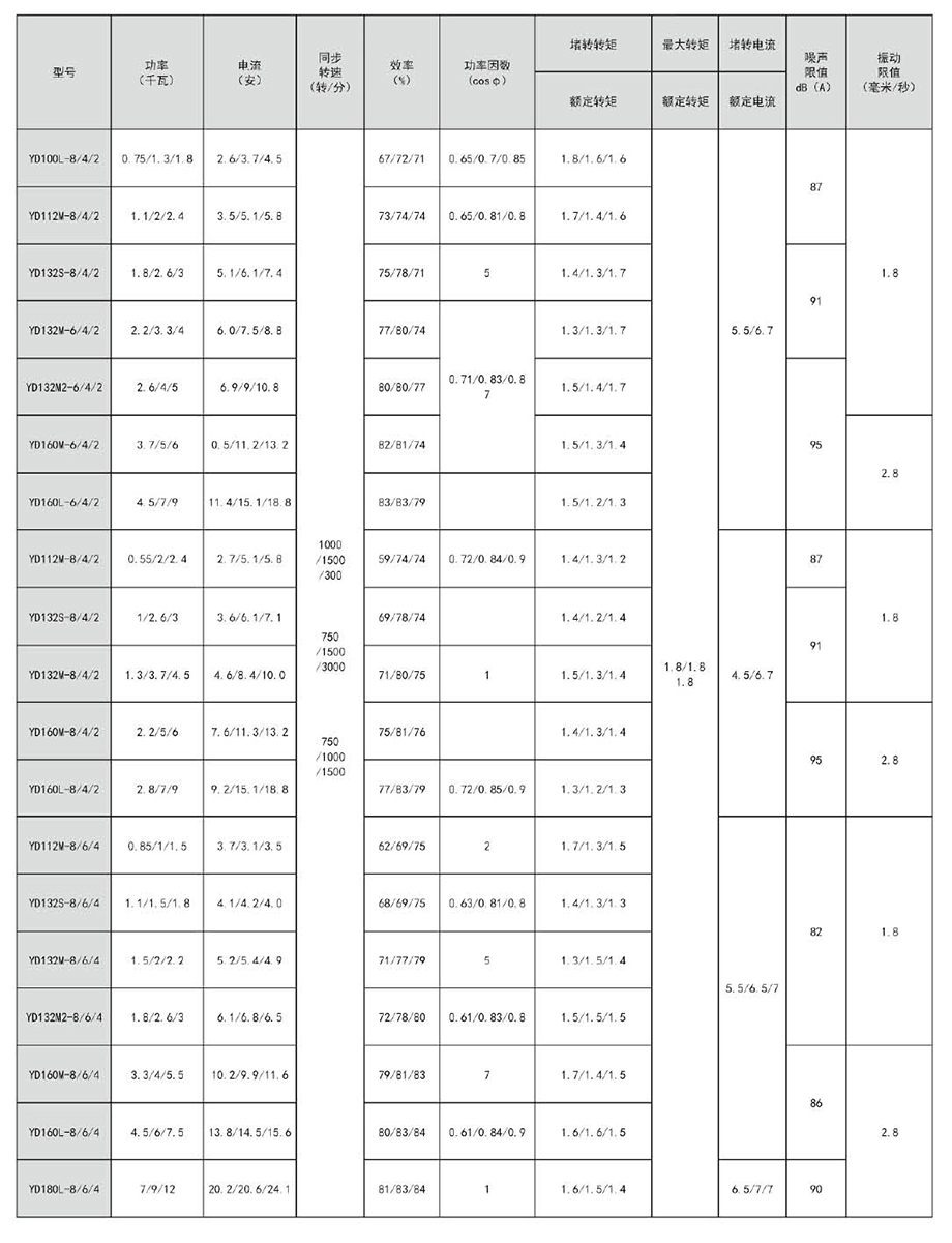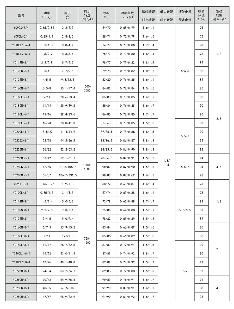 YD系列變極多速三相異步電動機(jī)可以與手動控制、接觸器、控制器械等一起進(jìn)行速度控制,節(jié)約大量電能。采用改變繞組的接法來變換電機(jī)的轉(zhuǎn)速和輸出功率,使期與機(jī)械設(shè)備的負(fù)載特性相匹配,簡化了變速系統(tǒng),高效,節(jié)能。本系列電機(jī)轉(zhuǎn)速有雙速、三速和四速三種,極數(shù)比有412、6/4、8/4、12/6、6/4/2、8/4/2和8/6/4、12/8/6/4等九種,其主要性能指標(biāo)和國外同類產(chǎn)品的先進(jìn)水平相當(dāng),較老系列有較大提高。