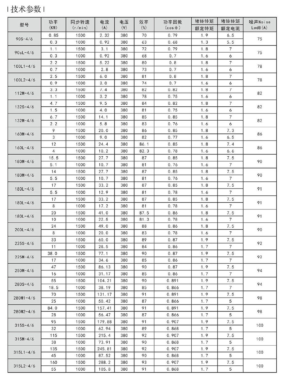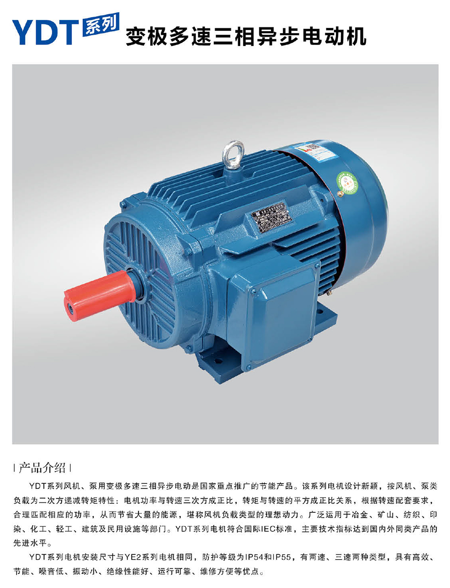 YDT系列風(fēng)機(jī)、泵用變極多速三相異步電動(dòng)是國家重點(diǎn)推廣的節(jié)能產(chǎn)品。該系列電機(jī)設(shè)計(jì)新穎,按風(fēng)機(jī)、泵類負(fù)載為二次方遞減轉(zhuǎn)矩特性:電機(jī)功率與轉(zhuǎn)速三次方成正比,轉(zhuǎn)矩與轉(zhuǎn)速的平方成正比關(guān)系,根據(jù)轉(zhuǎn)速配套要求,合理匹配相應(yīng)的功率,從而節(jié)省大量的能源,堪稱風(fēng)機(jī)負(fù)載類型的理想動(dòng)力。廣泛運(yùn)用于冶金、礦山、紡織、印染、化工、輕工、建筑及民用設(shè)施等部門。YDT系列電機(jī)符合國際IEC標(biāo)準(zhǔn),主要技術(shù)指標(biāo)達(dá)到國內(nèi)外同類產(chǎn)品的先進(jìn)水平。