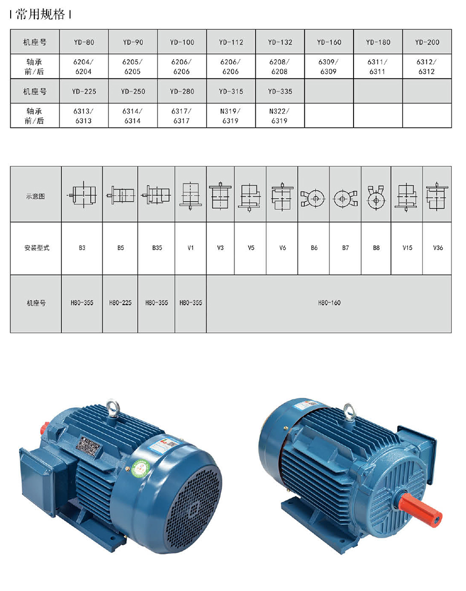 YDT系列電機(jī)安裝尺寸與YE2系列電機(jī)相同,防護(hù)等級為IP54和IP55,有兩速、三速兩種類型,具有高效節(jié)能、噪音低、振動(dòng)小、絕緣性能好、運(yùn)行可靠、維修方便等優(yōu)點(diǎn)。